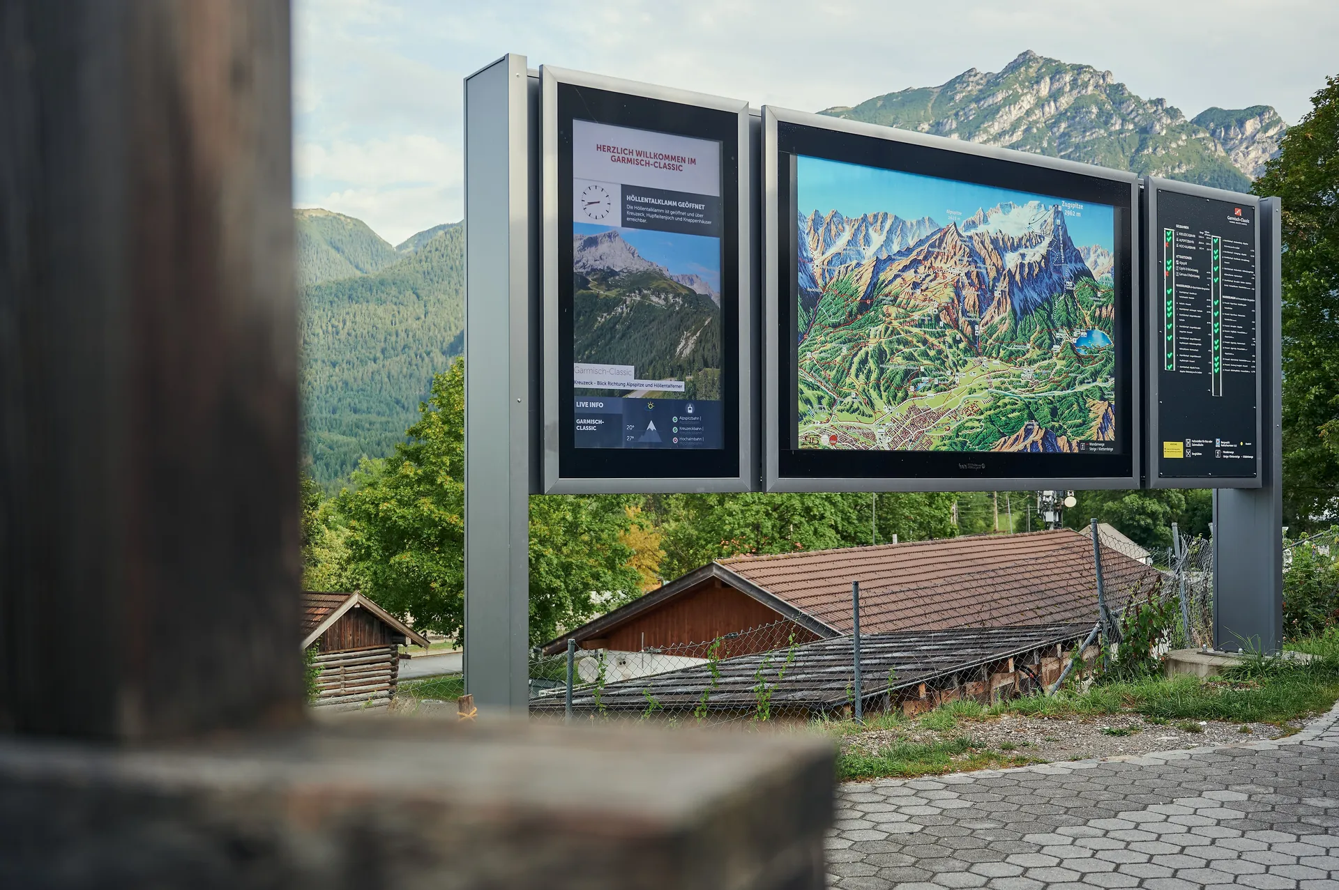 Ob im Winter oder Sommer unsere Panorama-Infoanlage ist als Tafel oder als Spanntuch-Variante - mit oder ohne LED-Technik –, stets flexibel saisonal einsetzbar.